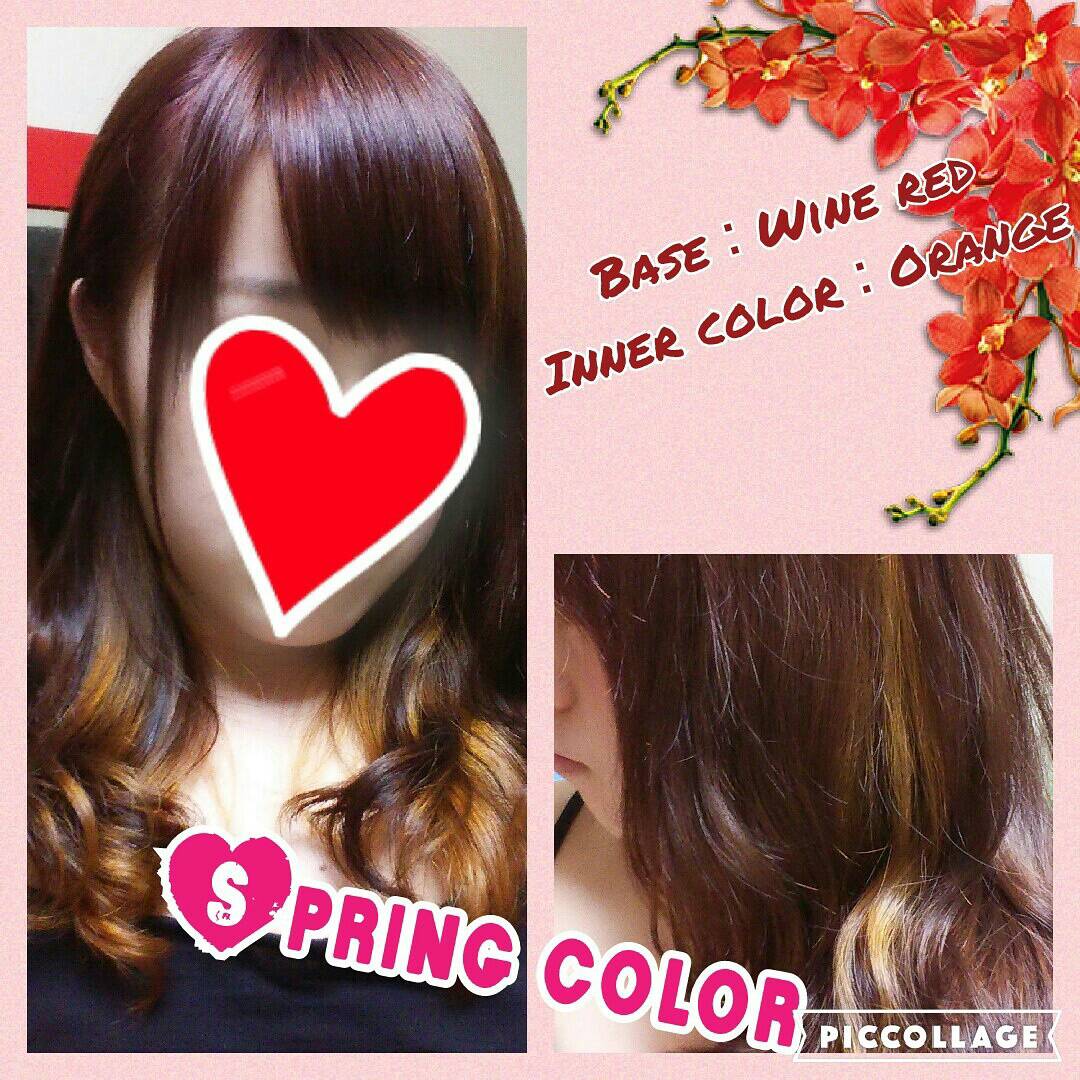こんにちは🎵 エスアンドエフ美容室 halo※haloの杉本です❗ 前回載せた鷲巣さんのインナーカラーに色を入れてみました✨  ベースはワインレッド系でインナーカラーはオレンジを入れました❗やはりベースを暗くするとよりインナーカラーがわかりやすくなって可愛いですね(ノ≧▽≦)ノ 流行りも色々なのでたくさんチャレンジしてみたいと思います☺