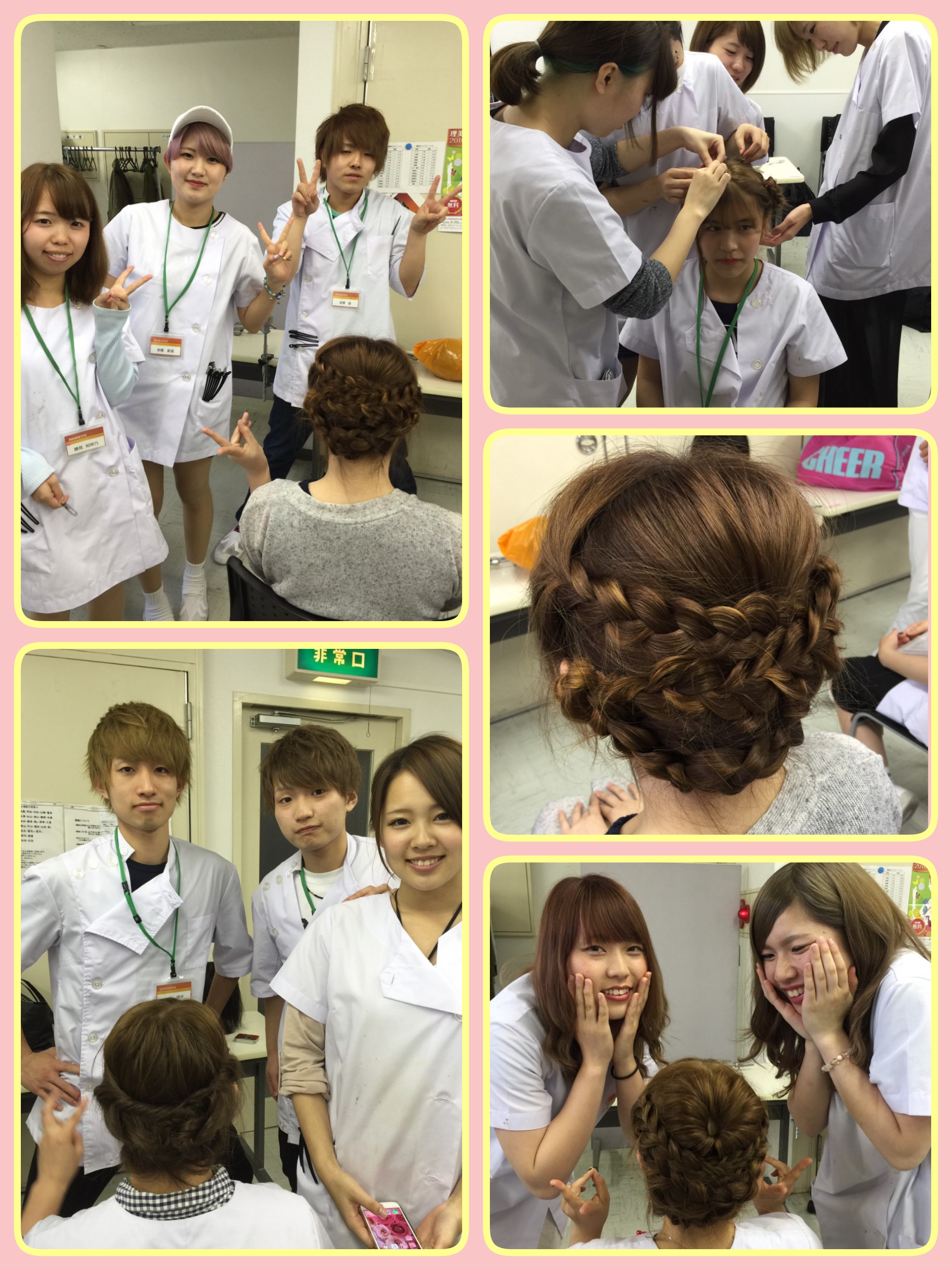 今回は、①三つ編み ②ねじる ③ゴムで結ぶ ④ピンで止める ⑤くずす ⑥くるりんぱ という6つの行程を使って、3スタイルのアップを練習しました‼